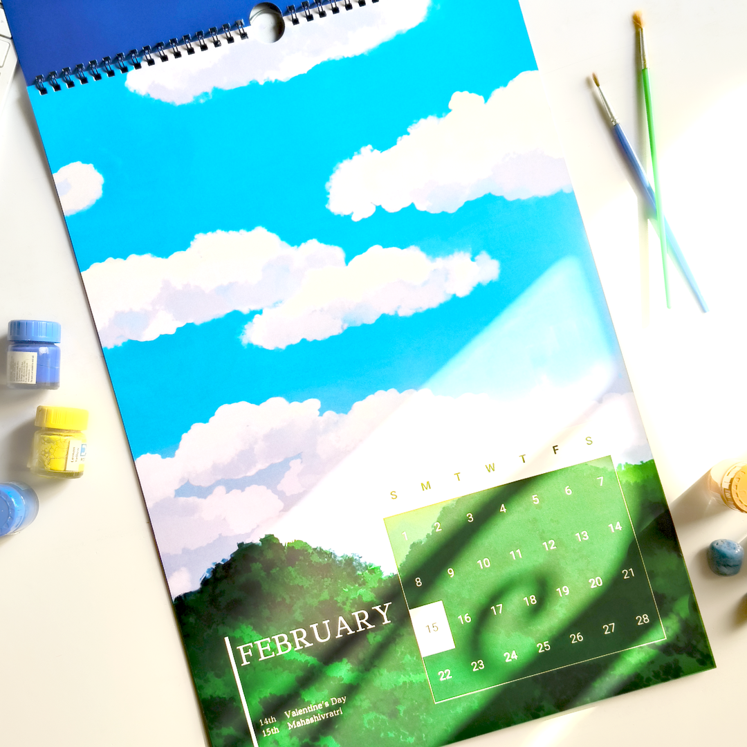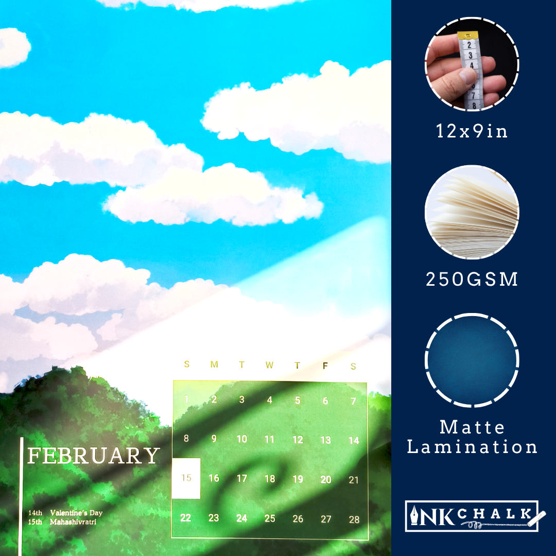 This wall calendar features 12 breathtaking, full-page anime landscapes, from coastal roads to sakura valleys, with dates seamlessly woven into the art. Professionally printed on 250 GSM paper and finished with matte lamination for smudge resistance and a premium tactile feel. Includes all 2026 Indian holidays for effortless planning.