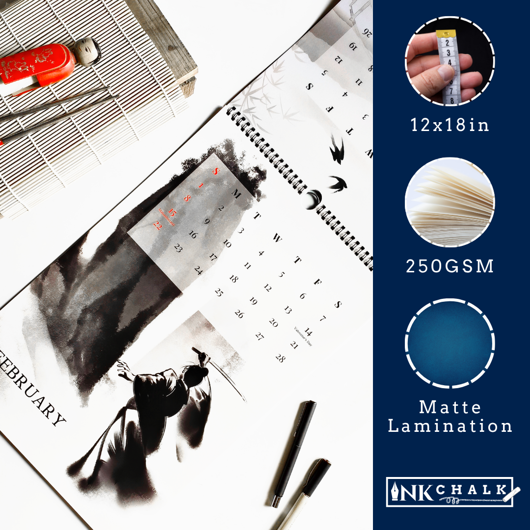 Embrace the harmony of discipline and artistry with the Samurai Zen 2026 Wall Calendar. Each month reveals a striking black-ink samurai in fluid motion, drawing a bow, mid-sword strike, or in poised observation, rendered in the elegant style of Japanese calligraphy. The minimalist white background and smooth brushstrokes create a serene contrast, transforming fierce stances into meditative art. Printed on 250gsm matte-laminated paper, this calendar balances bold visuals with tranquil simplicity. The wiro-bound hanging design ensures easy display, while marked Indian holidays add practicality. Perfect for martial arts enthusiasts, admirers of Japanese culture, and lovers of clean, powerful design.